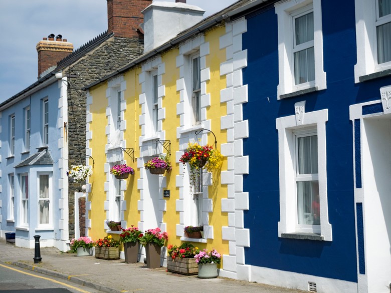 Fe gynlluniwyd y tai yn yr arddull Sioraidd, ac wedi eu peintio’n lliwiau amrywiol gyda phatrwm rendr gwyn ar yr ymylon, tebyg i ymyl stamp. Fel mae'n digwydd, fe ymddangosodd yr adeiladau hyn ar y stamp ceiniog mewn cyfres i ddathlu pensaernïaeth wledig Prydain.