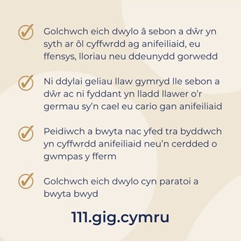 Ffoniwch wasanaeth GIG 111 Cymru (drwy ddeialu 111) dim ond os yw eich pryder iechyd yn un brys neu os ydych chi wedi cael eich cyfeirio ato gan y gwiriwr symptomau ar-lein. Bydd hyn yn helpu cleifion i gael y gefnogaeth a'r arweiniad cywir yn y lle cywir ar yr amser cywir.