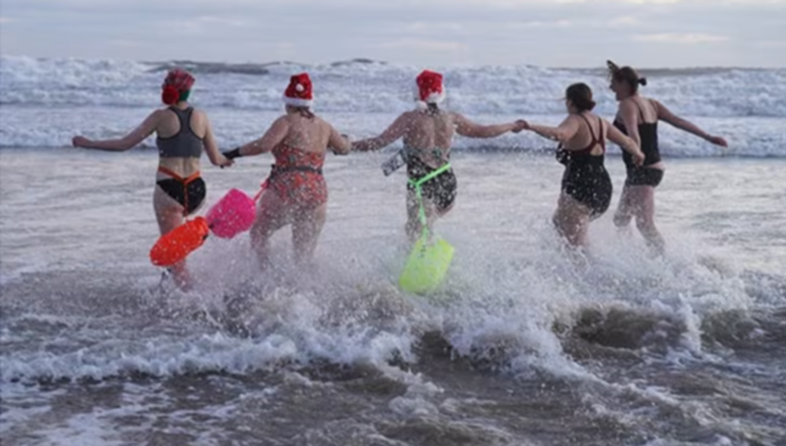 Ceredigion has several cold water swimming groups, and the villages of Llangrannog and Aberporth have annual ' Santa swims' on Christmas morning, Boxing Day or New Year's Day. Llangrannog yw'r cyntaf fel arfer, ar fore dydd Nadolig, gyda Aberporth yn dilyn ar Wyl San Steffan.